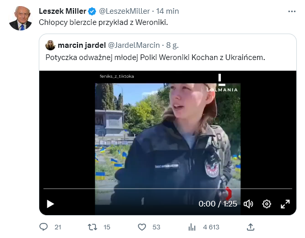 Weronika Kochan, o której napisał europoseł Miller, to osoba blisko związana z przestępcą Wojciechem Olszańskim – liderem Kamratów – i jego partnerem Marcinem Osadowskim. Na filmiku udostępnionym przez Millera, młoda dama wykrzykuje w stronę mężczyzny z Ukrainy ksenofobiczne hasła. „Chłopcy, bierzcie przykład z Weroniki” – zaleca były lider SLD.