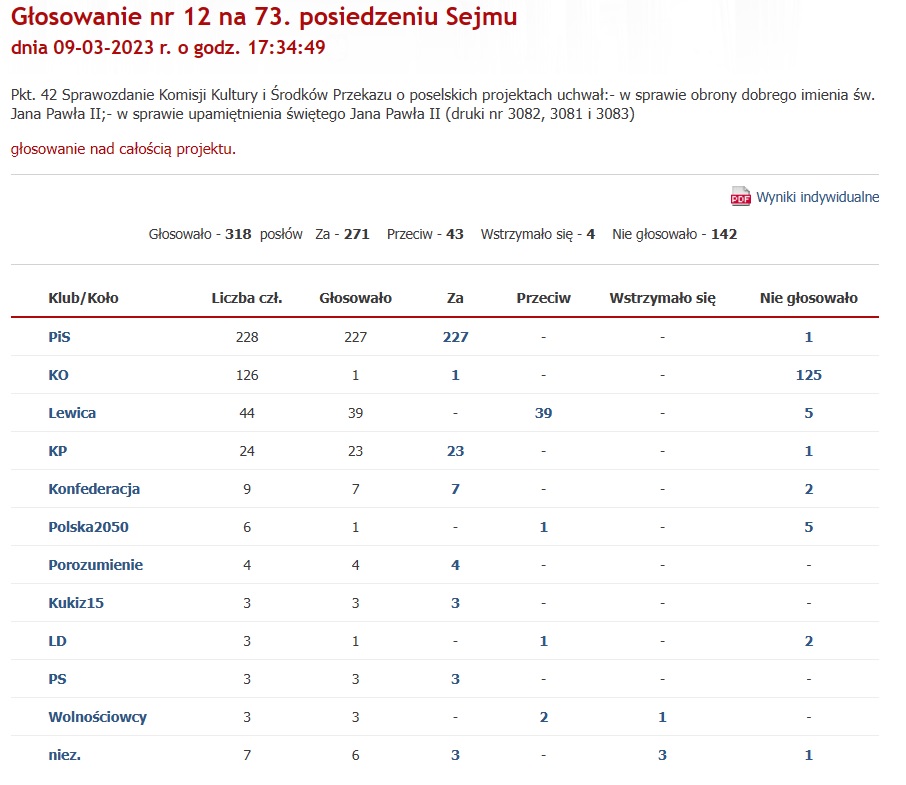 Podczas debaty nad projektem uchwały w sejmie było gorąco. Głos zabierali posłowie wszystkich klubów i kół poselskich. Ostatecznie niemal wszyscy deputowani, którzy głosowali, poparli projekt. Wyjątek stanowili posłowie Lewicy, którzy przodowali w rozpowszechnianiu oszczerstw na temat Jana Pawła II nie tylko w ostatnich dniach, ale również w ostatnich latach. Kontynuowali tym samym działania swoich komunistycznych władz PRL, czyli swoich politycznych przodków, którzy w Ojcu Świętym widzieli największego wroga dla swojej totalitarnej, antyludzkiej i antychrześcijańskiej ideologii.