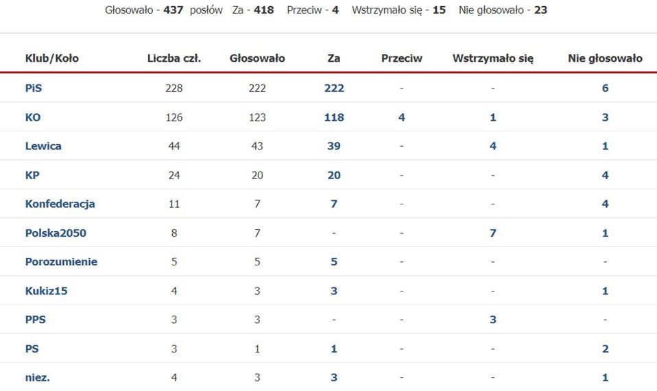 Poniżej prezentujemy wyniki głosowania z podziałem na kluby/koła poselskie: